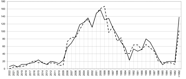 Las bajas definitivas aumentan un 3,8% en 2022, con una edad media de 23,5 años, 1 año y 1 mes más que en 2021 y 2 años y 4 meses más que en 2020. Es una señal más del envejecimiento del parque y con una evolución negativa en los últimos años. Es muy llamativa la cantidad de semirremolques que se dan de baja con 40 o más años.