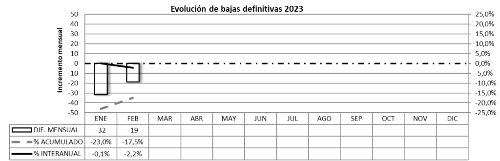 Las bajas definitivas caen un -12% en febrero (134/153), -17,5% en dos meses (241/292) y -2% en un año (2367/2421). La edad media se sitúa en 22,8 años, 1 año más viejos que en 2022.