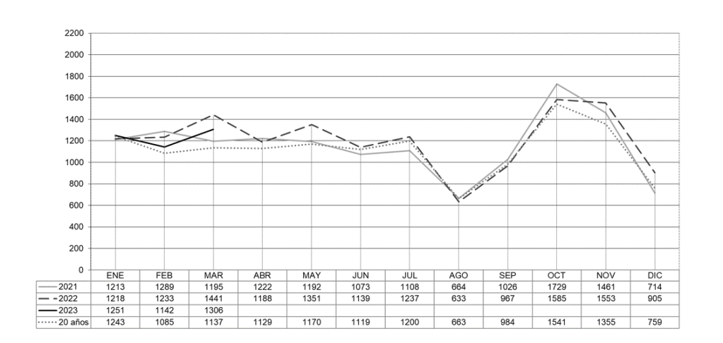 Los remolques y semirremolques en marzo suman 1306 ud (-9%, 1441), 3699 ud en el primer trimestre (-5%, 3892) y deja el interanual en 14257 veh/año (+1,2%, 14081).