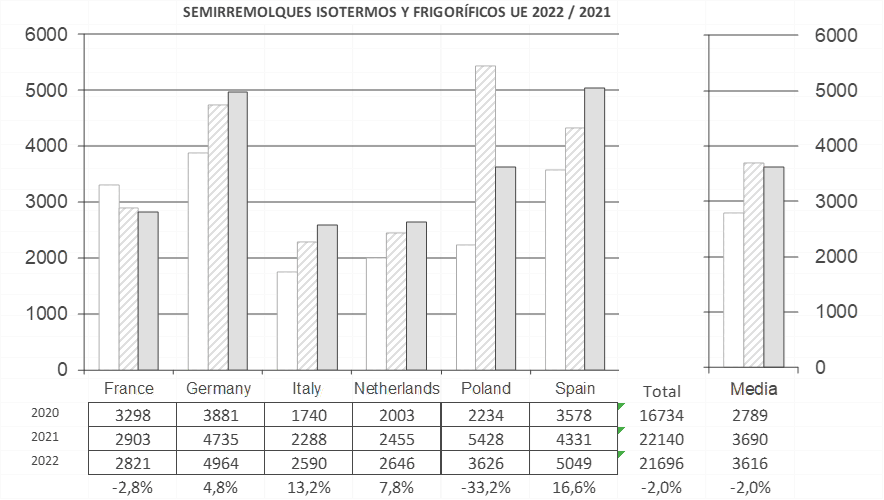 El mercado español de semirremolques isotermos y frigoríficos se situó por primera vez en la primera posición de los países europeos, con 5049 unidades en 2022, seguido por 4964 semirremolques en Alemania y 3626 en Polonia. Sumando también los remolques alcanzó las 5059 ud, cerca de Alemania con 5226 remolques y «semis».