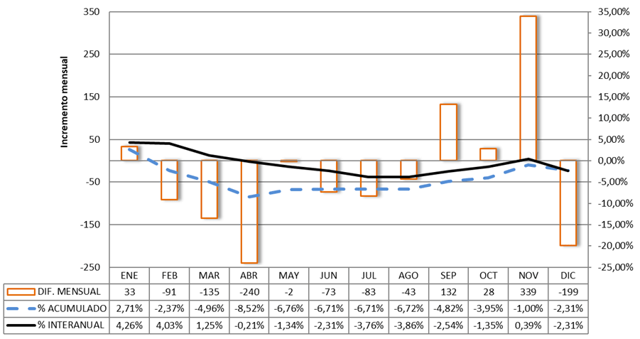 Por trimestres, el primero bajó -5% y el segundo -8,5%, dejando el primer semestre con un -6,7%, bajada que se mantuvo constante desde mayo hasta agosto. Septiembre cambió la tendencia y puso el tercer trimestre en positivo (+0.2%), para subir en el cuarto un +4,2% y dejar el segundo semestre con un aumento del +2,5%. El ejercicio acaba con un descenso del -2,3% y una recuperación final que casi ha compensado las bajadas de la primera parte del año.