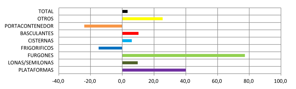 En el trimestre destaca la subida importante de furgones, dollys y plataformas, seguidos por aumentos en lonas, basculantes y cisternas. Descensos en frigoríficos respecto al año anterior, pero con casi 4500 vehículos en los últimos doce meses, y portacontenedores.