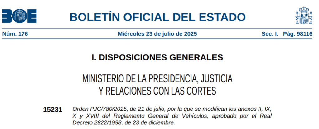 Hoy se ha publicado en el BOE la Orden PJC/780/2025 por la que se modifican los anexos II, IX y X del Reglamento General de Vehículos, aprobado por el Real Decreto 2822/1998, de 23 de diciembre.