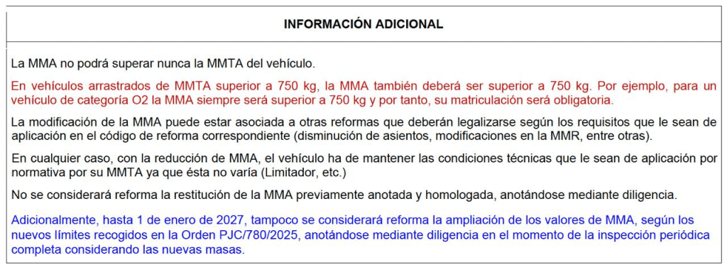 Se ha añadido en la reforma 11.2. (Variación de Masas Máximas Autorizadas) un párrafo en información adicional (en azul) para ampliar el plazo de la disposición transitoria segunda de la orden PJC/780/2025, que limitaba su aplicación a la primera inspección periódica después de su entrada en vigor. De esta forma, se puede tramitar por diligencia hasta el 1 de enero de 2027 aunque sea en posteriores inspecciones periódicas y no hará falta hacer reforma si se pasó la oportunidad de la primera inspección.